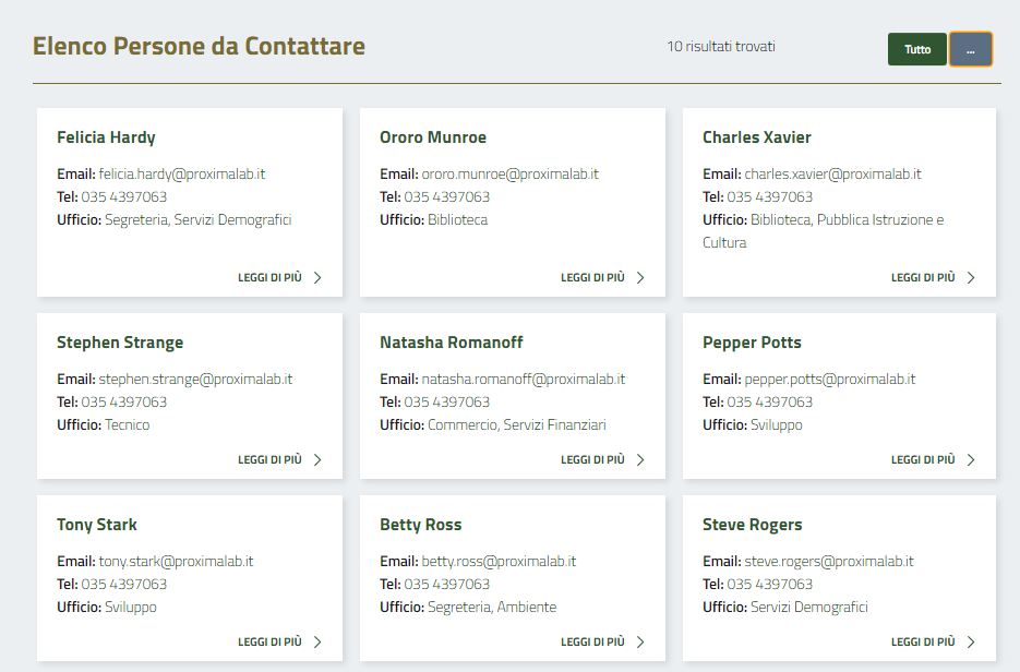 IntroduzioneCom'è fatto il sito?Amministrazione Personale Amministrativo In questa sezione sono presenti tutti i Dipendenti Comunali, ordinati in ordine alfabetico. E' possibile filtrare i risultati cliccando sui tre puntini in alto a destra, inserendo i parametri indicati