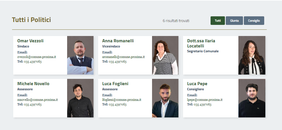 IntroduzioneCom'è fatto il sito?Amministrazione Politici In questa sezione sono presenti tutti i Politici, annoverati nella sezione precedente, ordinati in ordine alfabetico. E' possibile filtrare i risultati sulla base dell'organo di governo di appartenenza, ovvero Giunta o Consiglio.