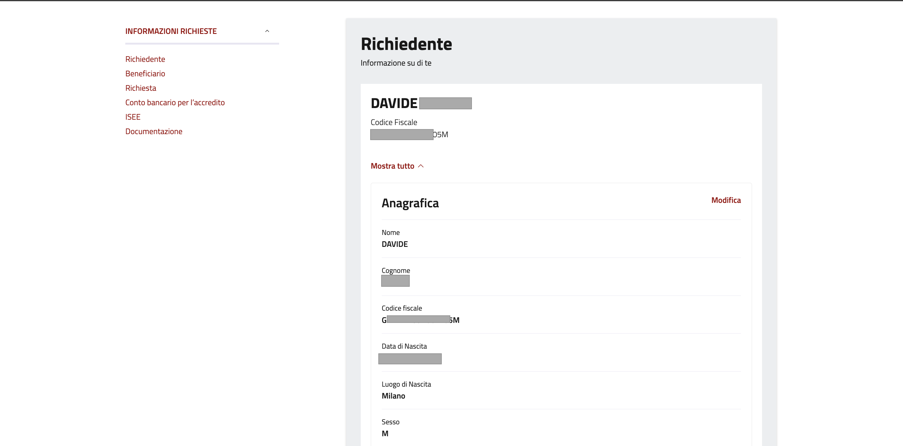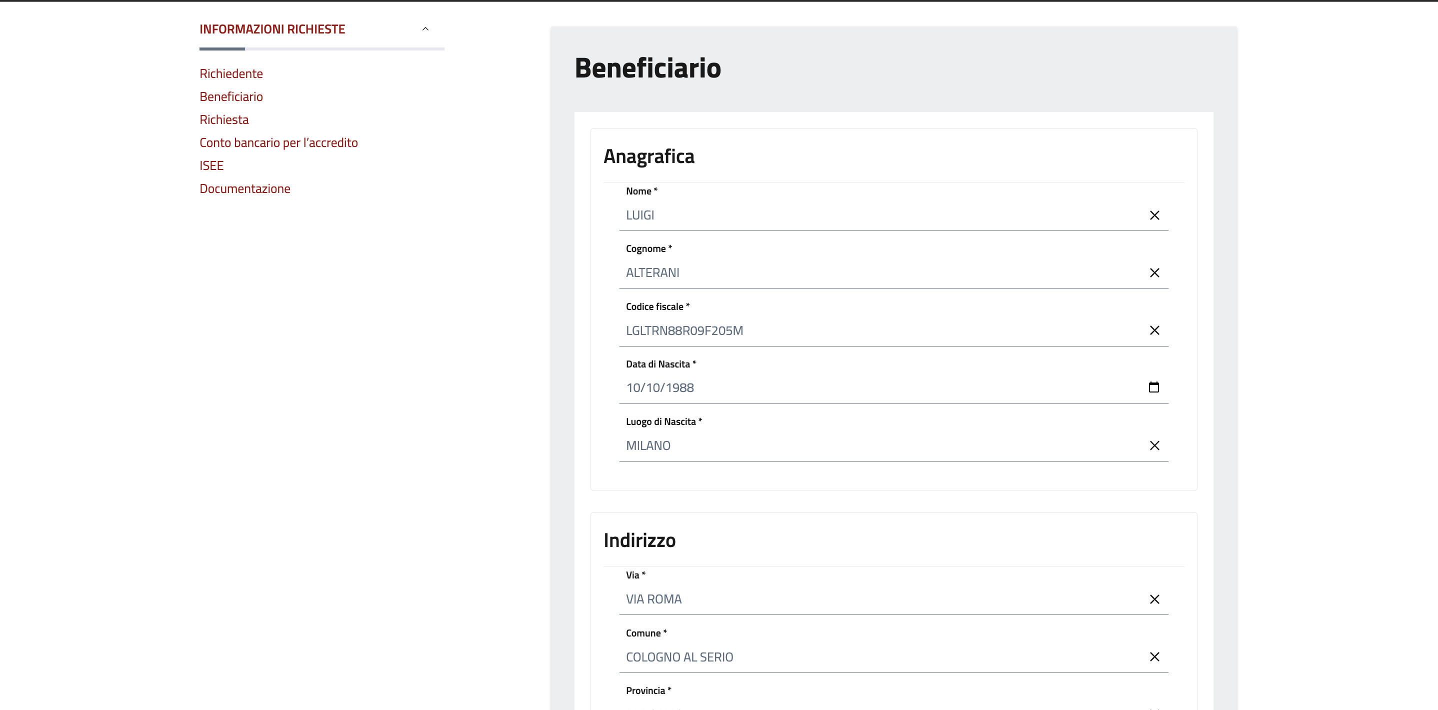 Nel caso in cui si stia presentando la domanda a nome di un altro soggetto, indicare anche i dati del beneficiario dell'istanza.
