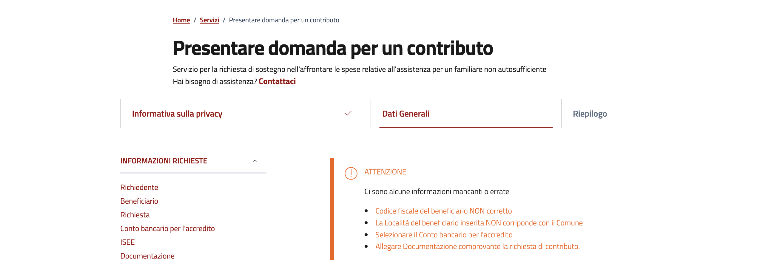 Cliccare su Avanti. Nel caso in cui qualche dato sia errato o l'istanza non completa comparirà un avviso di errore che indicherà la sezione da modificare.