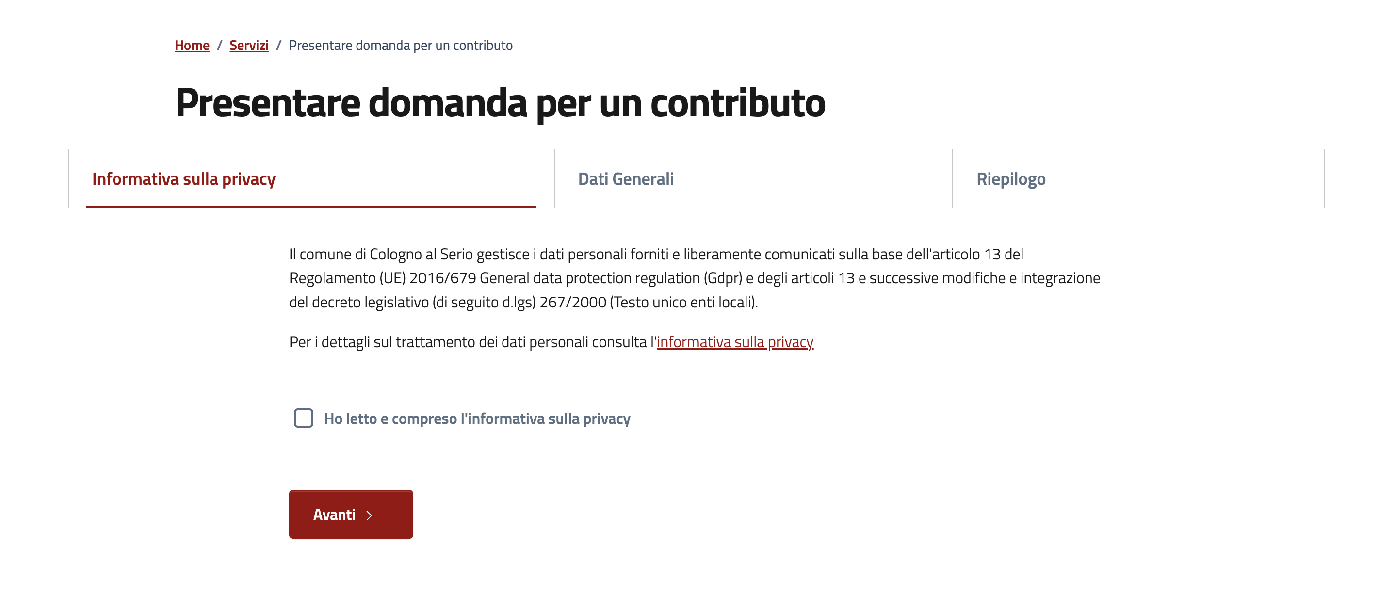 Ogni servizio ha un suo iter: in base all'istanza presentata, i dati, i documenti nonché i box da compilare potrebbero differire.
