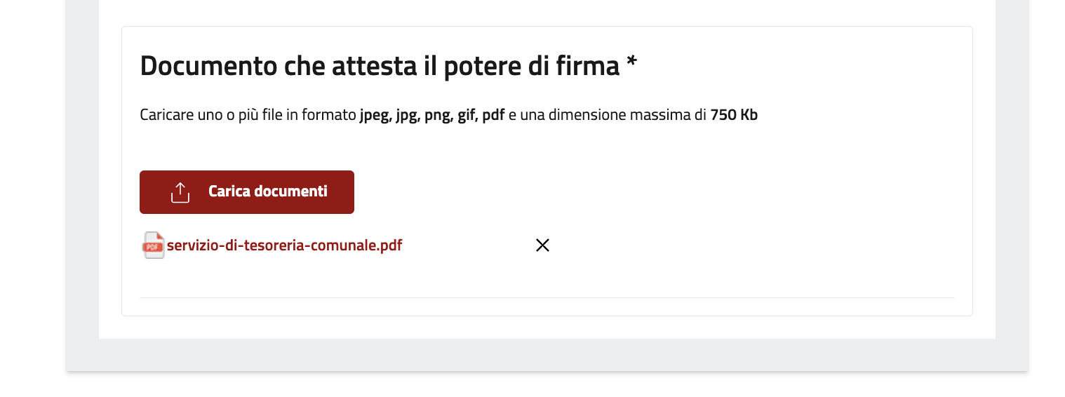 Nel box Allegati caricare tutti i documenti necessari cliccando su Upload. E' importante rispettare il peso e il formato indicato.