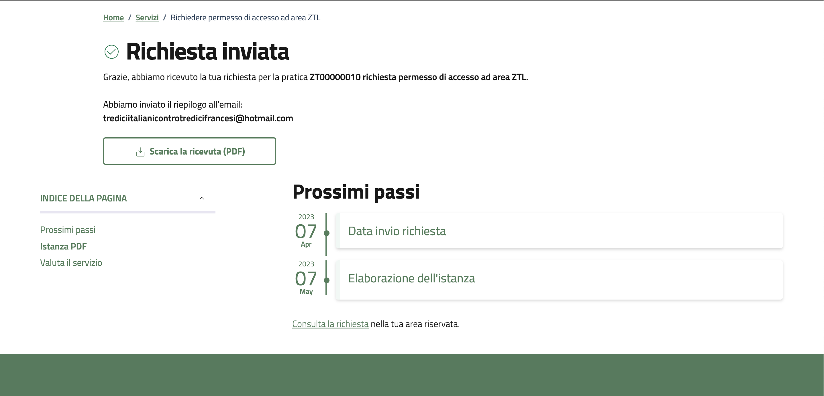 Una volta inviata è possibile ottenere la ricevuta dell'avvenuta protocollazione e le tempistiche di espletamento dell'istanza.